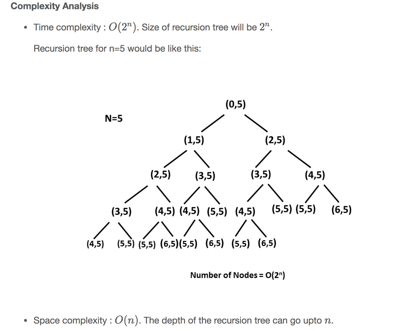 Time complexity :O(n)O(n). Size of recursion tree can go uptonn.